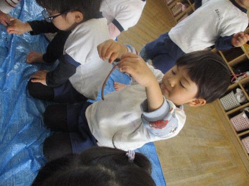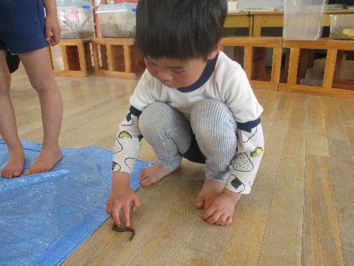 今日もミミズ見つけに行き、園に持って帰ってからミミズと一緒に遊びました!