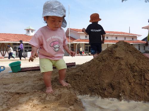 園庭で水遊び。北陵認定こども園の在園児さんの刺激を受けながらえがおハウスの子どもたちもホースから出る水に向かっていきます。砂場でも砂山や池が出来ました。遊んだ分、よく食べ、よく眠れます。たくさん遊んで、大きく成長していこうね!可愛い子どもたちの姿を見てください!