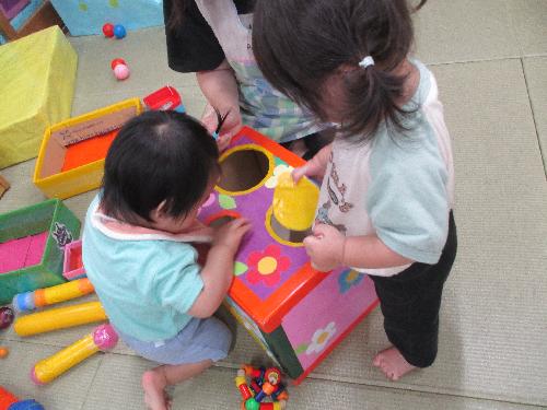 穴の開いた箱の中に上手におもちゃを入れていたり、、、