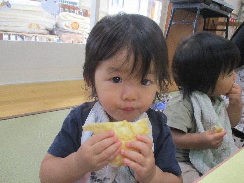 午後のおやつは大きなクレープを!まだ1歳になってない子たちは上手にハイハインを上手に食べました!