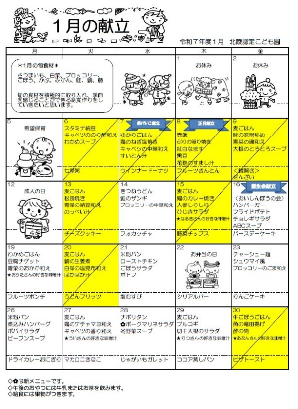 <1月の献立> 黄色枠以外のメニューが予約可能日です。