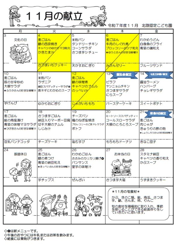 <11月の献立> 黄色枠以外のメニューが予約可能日です。