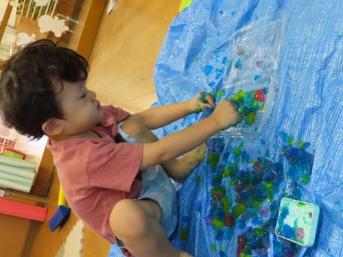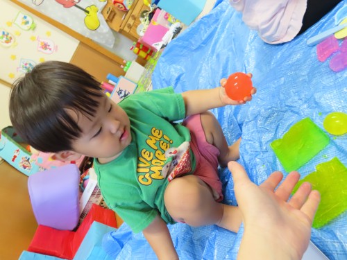 寒天を握りつぶして遊ぶ子・・