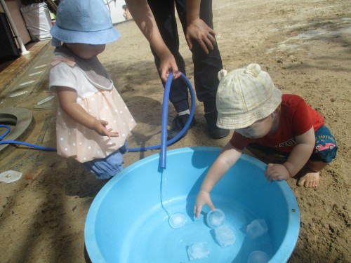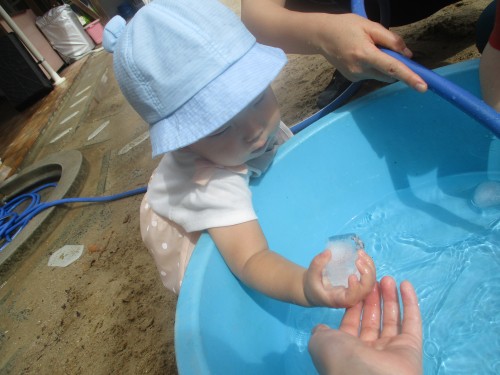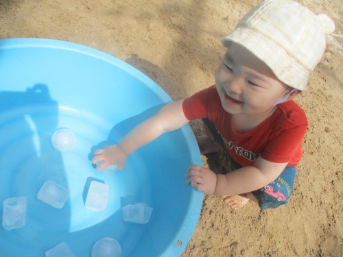 園庭では氷を触ったり、水に触れたり、園庭を走ったり、、、!