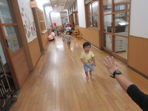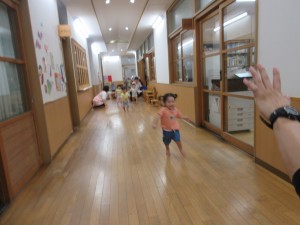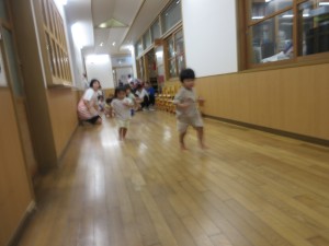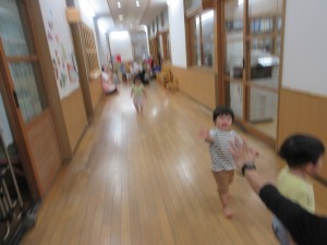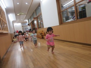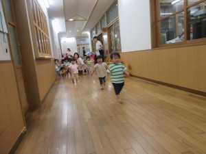 身体を動かして遊ぶことが大好きなりす組さん✨今日はながーい廊下でよーいどん!をしましたよ👏「用意はいーですか?」と聞くと元気よく「いーですよ!」と答え、「いちについてよーいどん!」の声に合わせて思いっきり走ることができました🌟