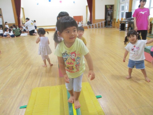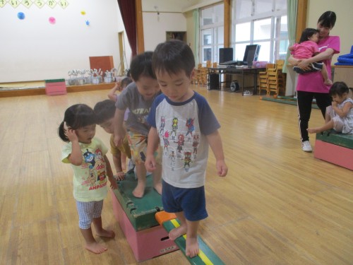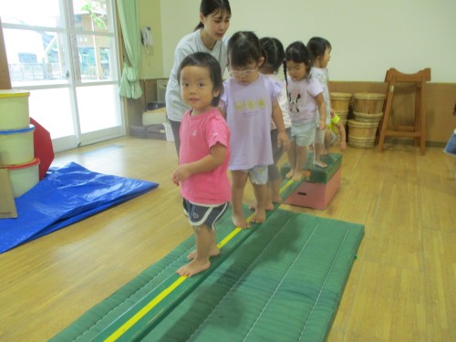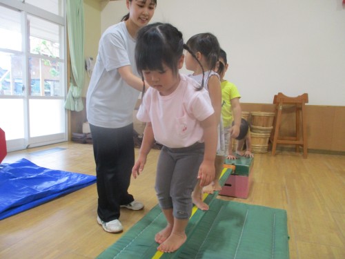 手をもって支え、すぐに手を離すと自分で渡れるように
