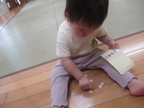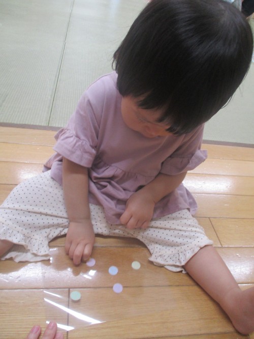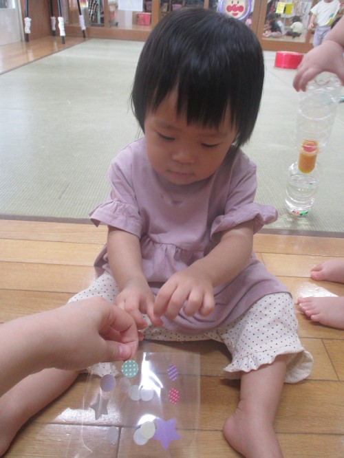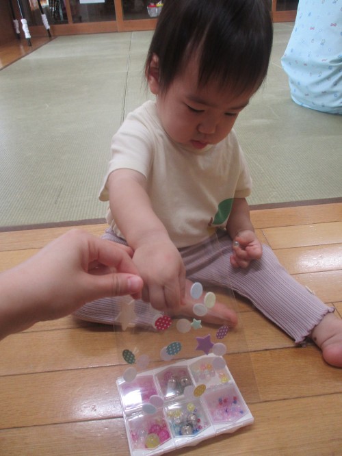 シールをぺたぺたして、袋にビーズ、スパンコールを入れました💛
