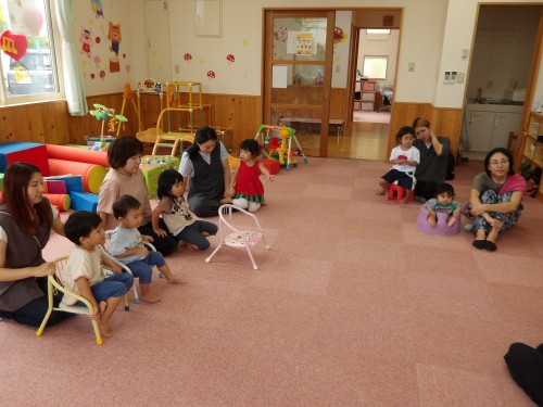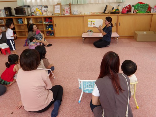 集まりでは、秋の歌を楽器を鳴らしながら歌ったり、名前を紹介したり、「きんぎょがにげた」「いちにちおもちゃ」の絵本を見ました😄
