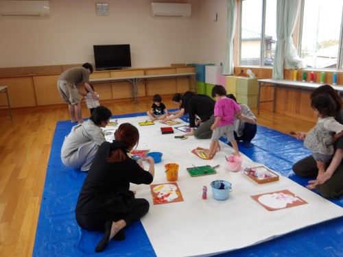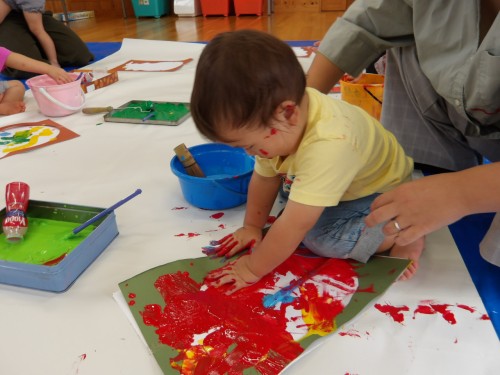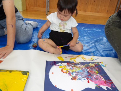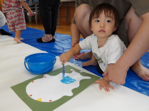 最初はおばけの製作、次に大きな模造紙に好きなように絵の具で色を塗りました!!