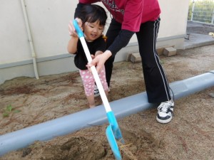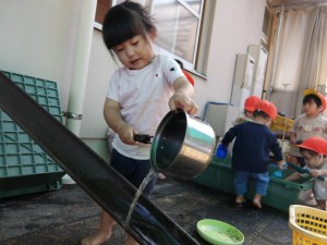 最近では動くものに興味を持つ子が増え、室内でおもちゃの車を斜面から走らせてみたり、水や松ぼっくりを樋に落として転がったり流れたりする様子を見て楽しむ姿が見られるようになってきました!