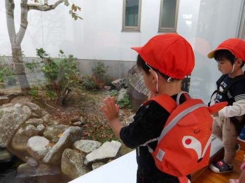 子どもたちの目の先にはいろいろな動きをする生き物たちが・・・・「おおきいね」「ちいさいね」「かめ」「カエル」「ちょきんちょきん」子どもたちは目に見たことを言葉にし保育者に伝えていました。