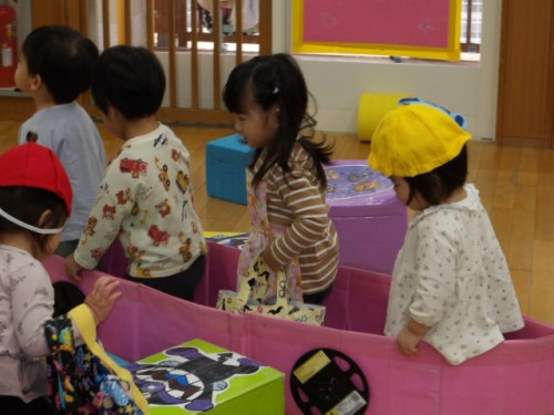 遠足から帰ると子どもたちの乗り物ブーム到来です!サークルの中に入り普段から「いってきまーす」「ばいばい」など乗り物で出かける姿が見られるようになりました。