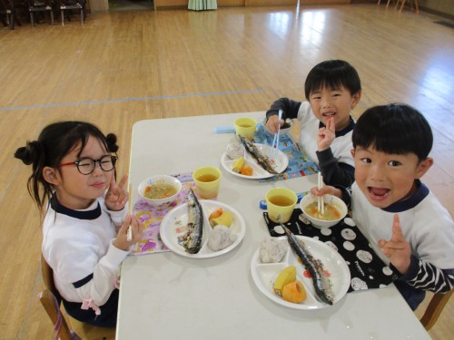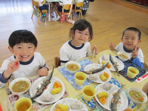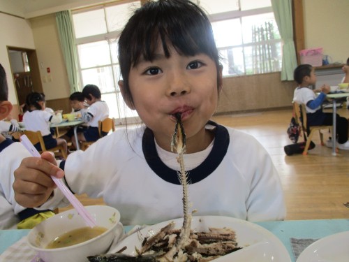 子どもたちは給食の先生に食べ方を教えてもらい、上手に骨と身を分けて食べました!