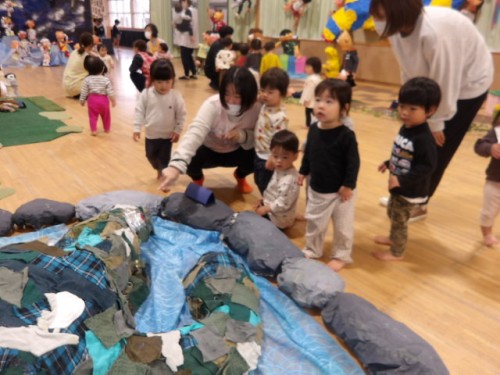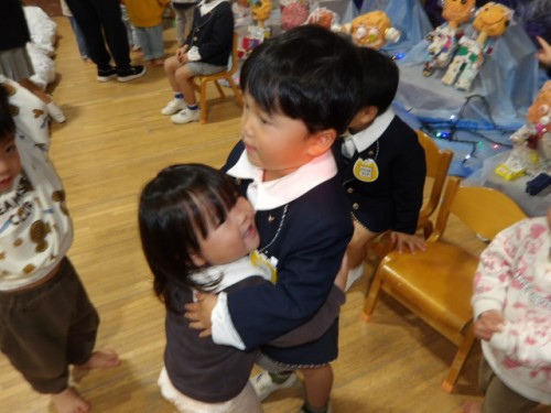 こういった場では異年齢の交流も見られます、大きいお兄さんお姉さんは小さい子どもたちにとてもやさしくしています。してもらったことは子どもたちの宝物になり、次はりす組の子どもたちが大きくなり小さい友達に同じ優しさを分けてあげるようになります。