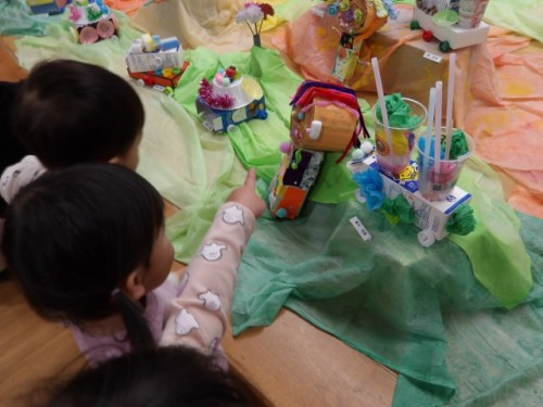 自分たちの作品では指をさし「あれだよ」「ばすがいる」など目を輝かせてみていましたよ!明日からいよいよ美術館です。気をつけてお越しください。