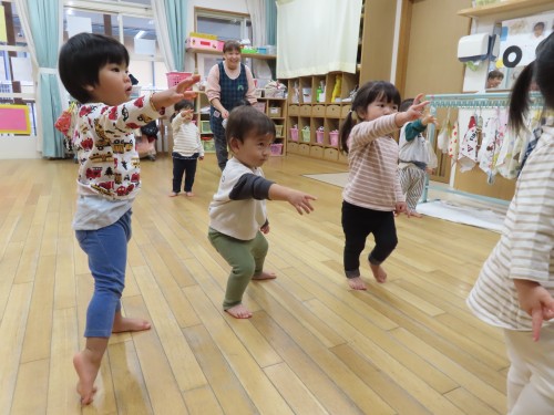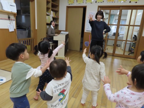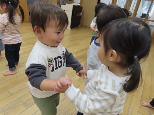 朝の会のではクリスマスの歌を歌ったり、やきいもグーチーパーをしたり、お友だちとペアになってひっつきもっつきをしたりしました🎵