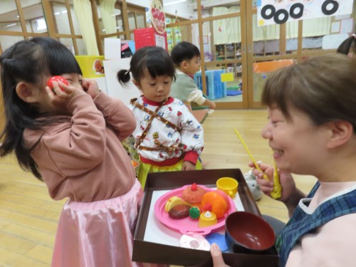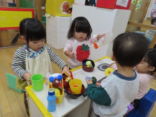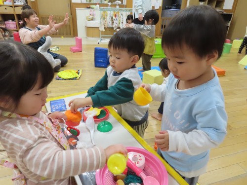 既製品のごちそうや日用品をつかっていつもの生活を再現して遊びを楽しんでいます。子どもたち同士で集まって同じ場所で遊ぶことも増えました⭐