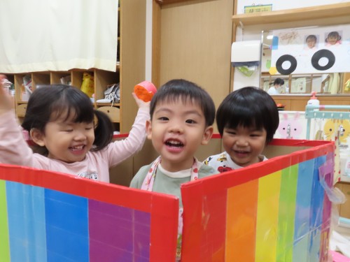 ここはお家!「いってきます」「ばいばーい」など別空間を仕切りがあることで再現し自然と言葉を交わしています。