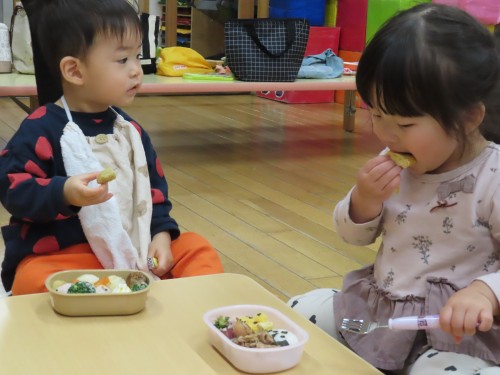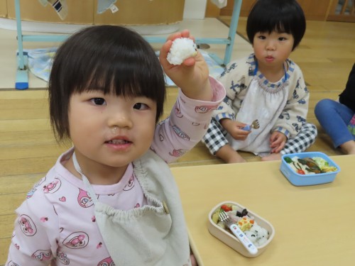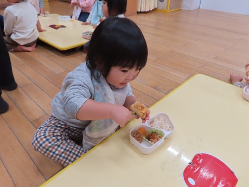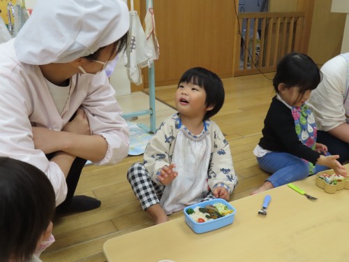 美味しいお弁当ありがとうございました♡弁当が開くと「わー」と子どもたちから自然に可愛い歓声・・・・聞いてもらいたかったです。周りの友達の弁当を見てにっこりわらいかけたり、「一緒」と卵を指さしていましたよ!