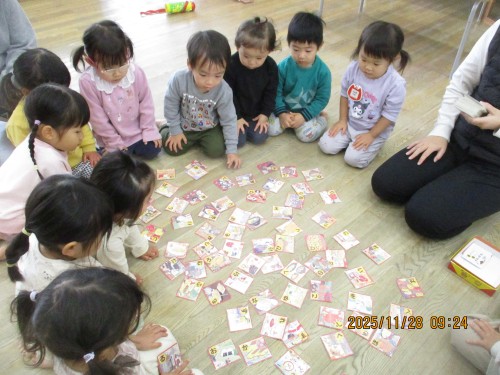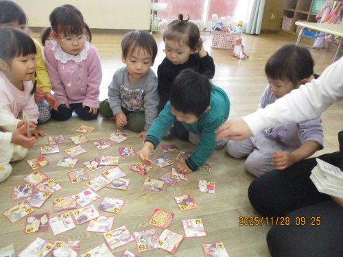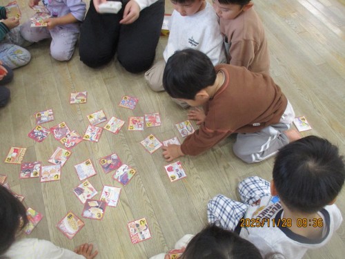 食べ物がイラストされたかるたで、ひばり組の