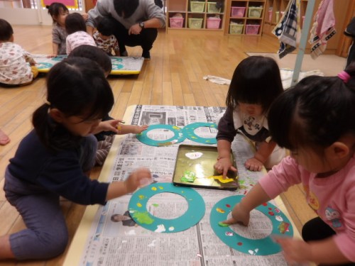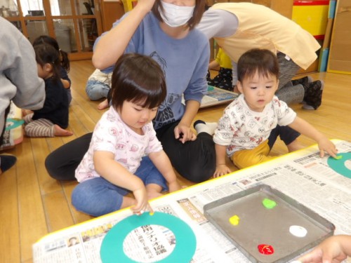 思い思いに絵の具遊びを楽しむ子どもたち、一人ひとり違った作品になりましたよ!