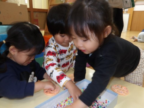 今回のオーナメントは紙粘土に色をつけてビーズを自分で選び埋め込んでいく作品です。子どもたちの一つひとつ選ぶビーズがかわいいですよ!みんなの願いが届きますように☆