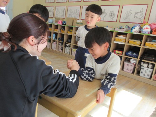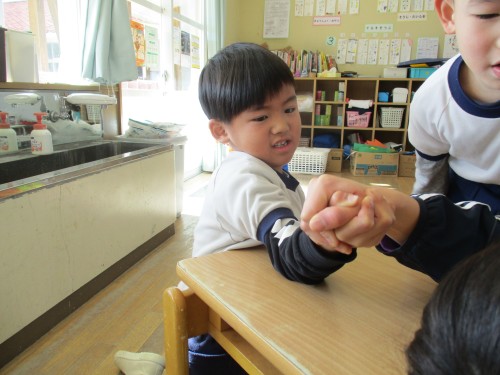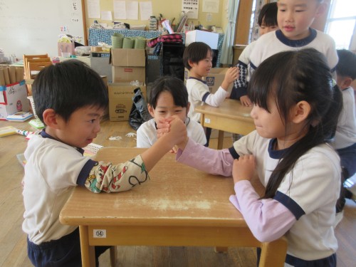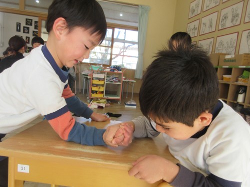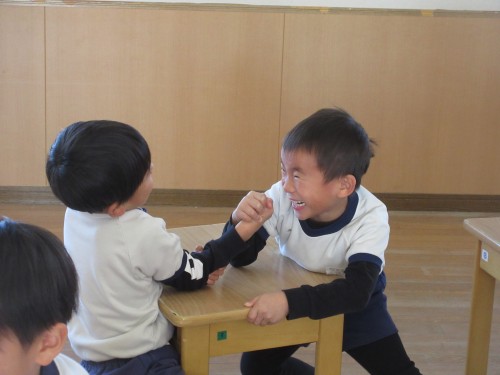 「先生!腕相撲しよう!!」この言葉から急遽ふくろう組腕相撲対決が始まりました。