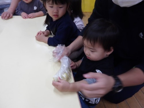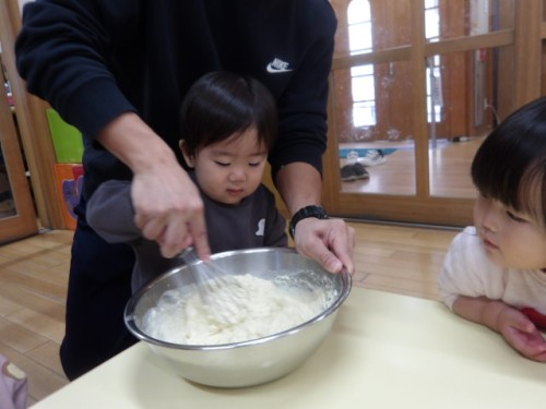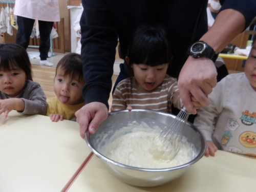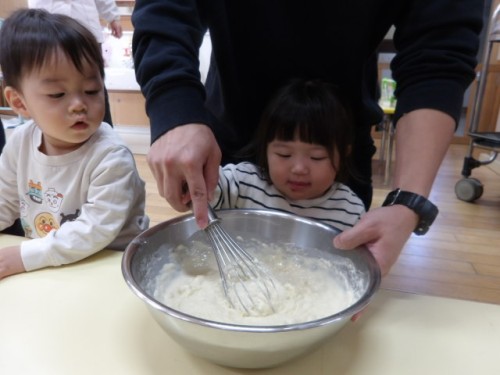 今日は給食先生に教えてもらって、さつまいものホットケーキを