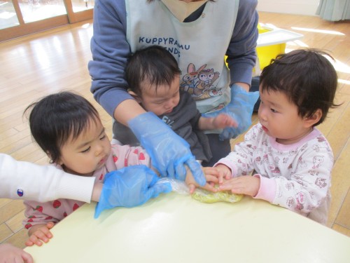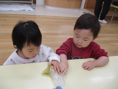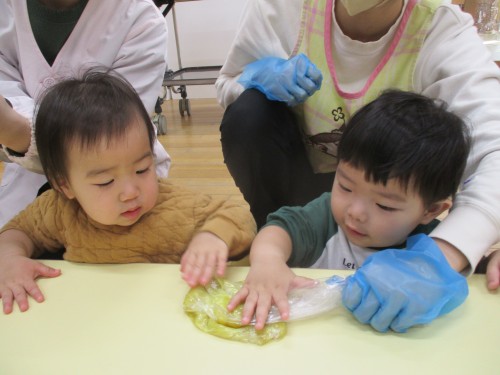 お芋を袋に入れて、にぎにぎ!感触を楽しみながら上手に手伝えたね✨