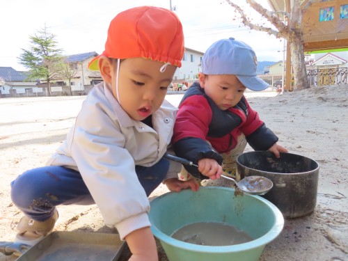 園庭ではごちそうを作って先生にくれたり、トロッコで道路ができたね!