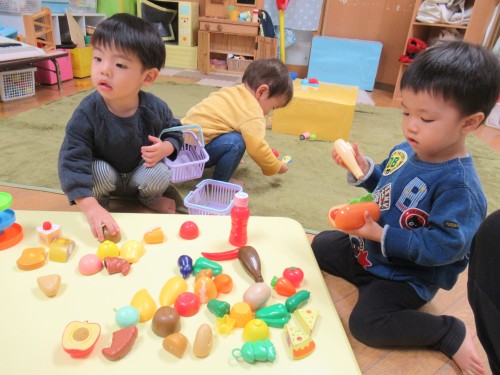 「いらっしゃいませ~」と先生が言うと「これちょうだい」って上手に言えたね