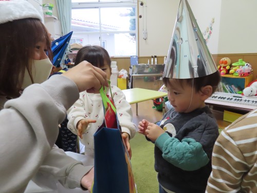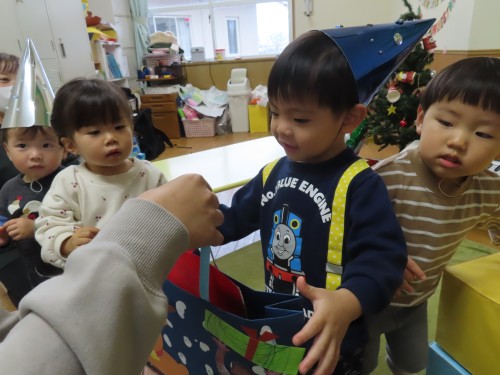 お部屋でクリスマスの絵本を見ていると「メリークリスマス~」サンタクロースがプレゼントを届けに来てくれました