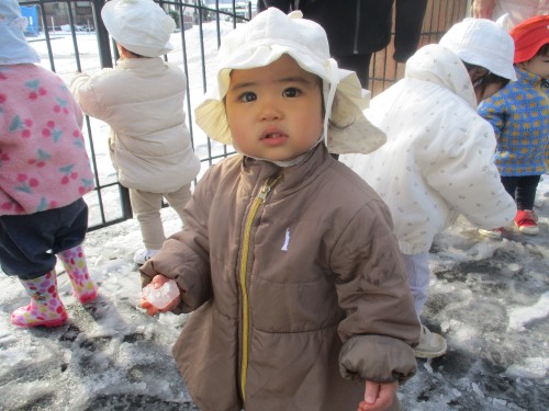 今日は雪が降り、保育園にも雪が積もっていたので、少しだけ触りにいきました❄