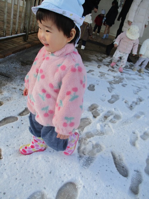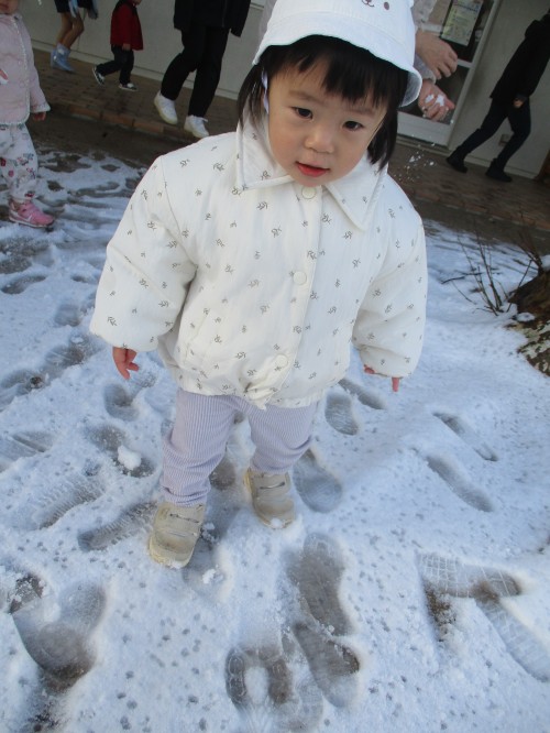 一面真っ白な園庭に大興奮なこどもたちで、歩いたり、ぺちゃぺちゃする姿が見られました😊