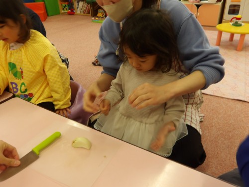 玉ねぎの皮を剥いて、お家の方と一緒に切ったり、