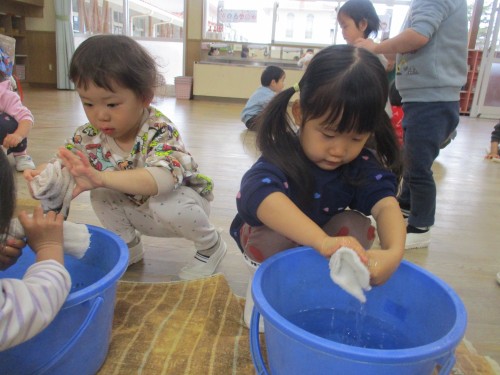 実際にみんなも雑巾を畳んでしぼってみました!