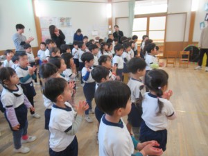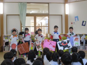 5人の1月生まれのお友だちがふくろう組の司会にインタビューとプレゼントを渡してもらったよ😊