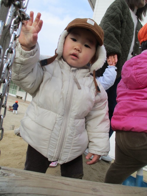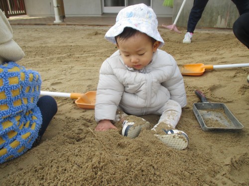 スコップに乗せた砂を大事に運んで先生に、、、「はい、どうぞ」としていました💓