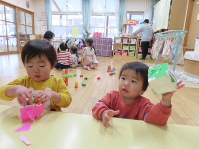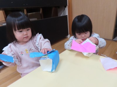 折り紙をビリビリちぎってペタペタ貼ったり、目や口を付けたりして個性豊かな可愛い升ができました!