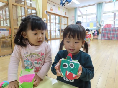 節分会の時にやってくる鬼に投げるボールの升づくりをしました!