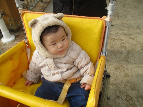 散歩車に乗ってぐるぐる園庭をお散歩!風が気持ちかったね😊