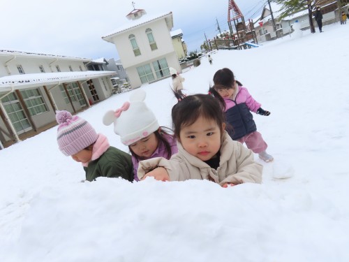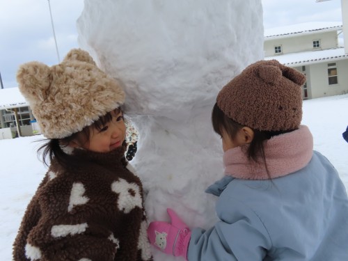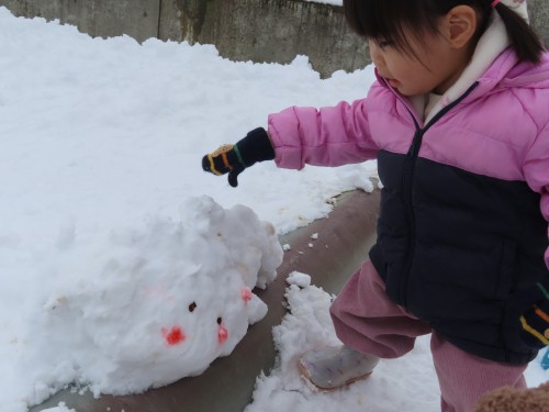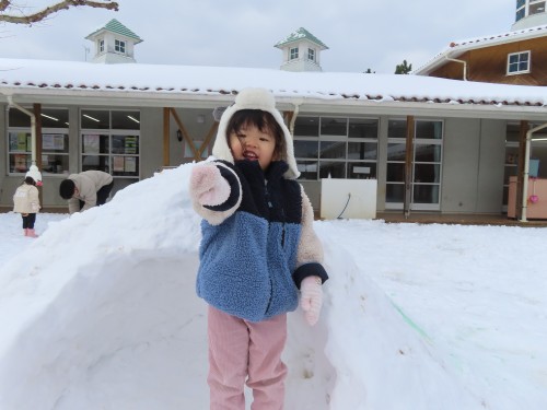 雪遊びに出るとお兄さんお姉さんが作っていた雪だるまとかまくらが・・・・子どもたちもおもいおもに遊ぶ姿が見られました。冷たい雪に触れると「さむーい」「つめたい」大きい雪ダルマをみて「おきいね、このひと」「ゆきいっぱい」などたくさん言葉も出ていましたよ!