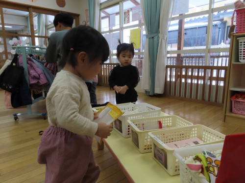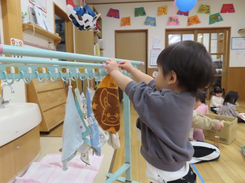 タオル掛けにタオルをかけたり、おはなしノートやおたより袋を決まったかごに出したり、子どもたちが目で見て自分でできるような環境を準備しています。手さきもきようになり自分でかけたり出したりが上手になってきました。