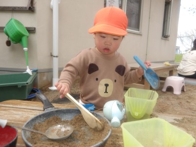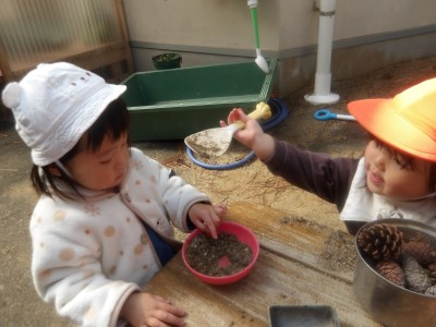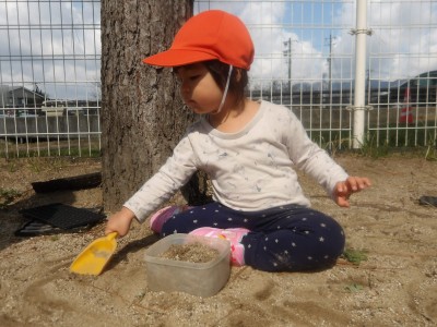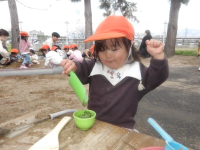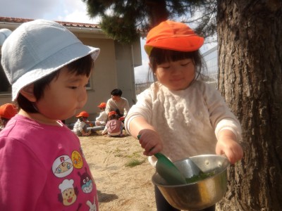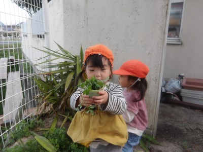 温かくなってきて緑が増えてきた中庭では植物を集めてままごとに使う姿もあります🌱