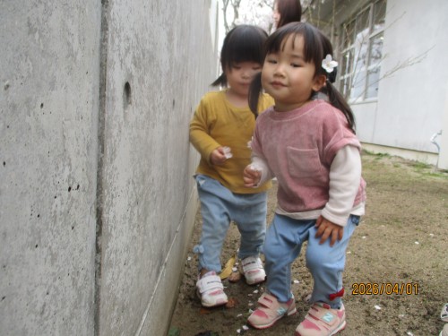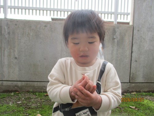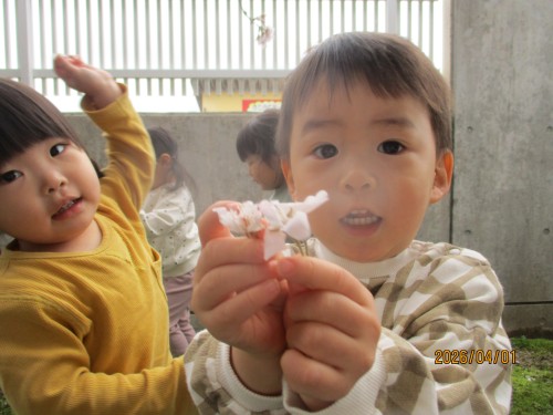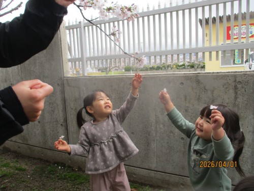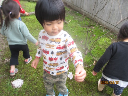 不安な顔を見せることもありましたが、今日は園舎裏に咲く桜を見に行くと目をキラキラさせて桜を見たり、手を伸ばして指さしたり、「ピンク~!」「さくら~」と興味津々でした!地面に落ちている桜を拾って「一緒~!」と担任と一緒なことも嬉しくてとても可愛かったです♡
