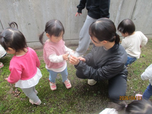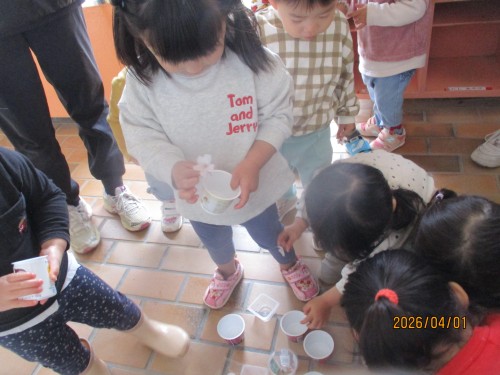 見つけた桜をカップに入れるお友だちも!