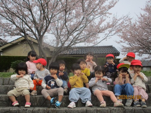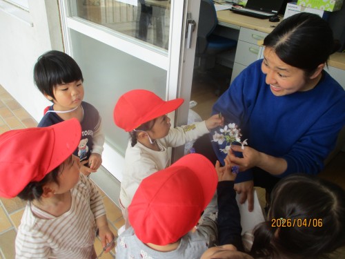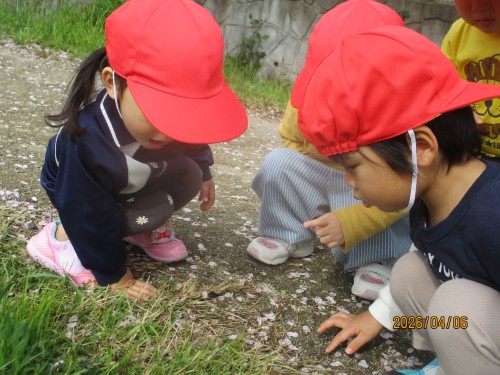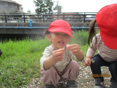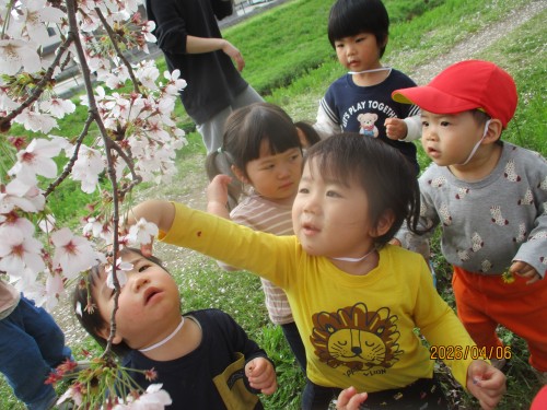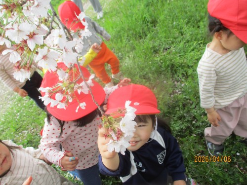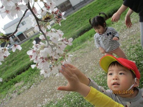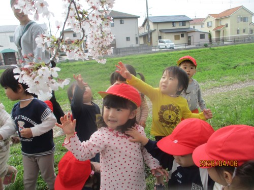 桜がとてもきれいで触るひばり組さん😊