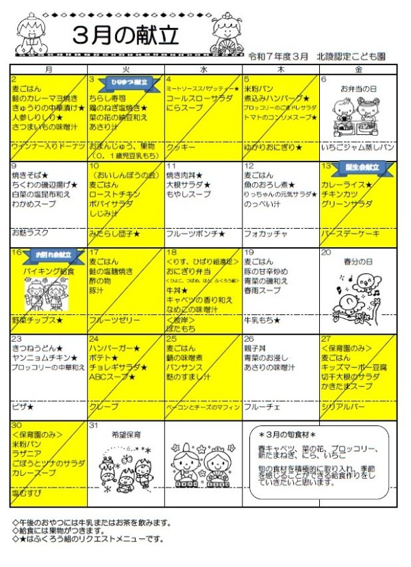 <3月の献立> 黄色枠以外のメニューが予約可能日です。