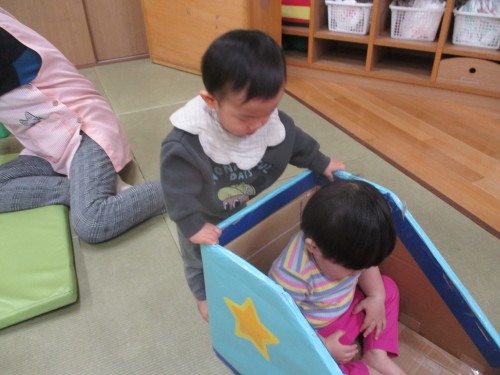 お友だちの乗っている箱押しを押そうと挑戦!!✨