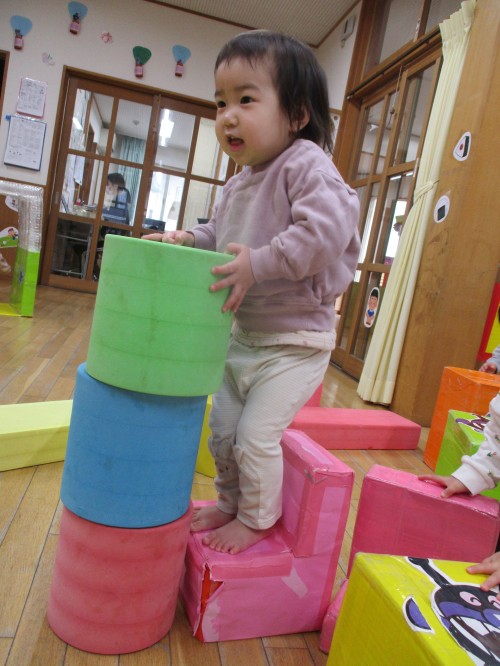 椅子に登って上手にソフト積み木を積んでいました✨